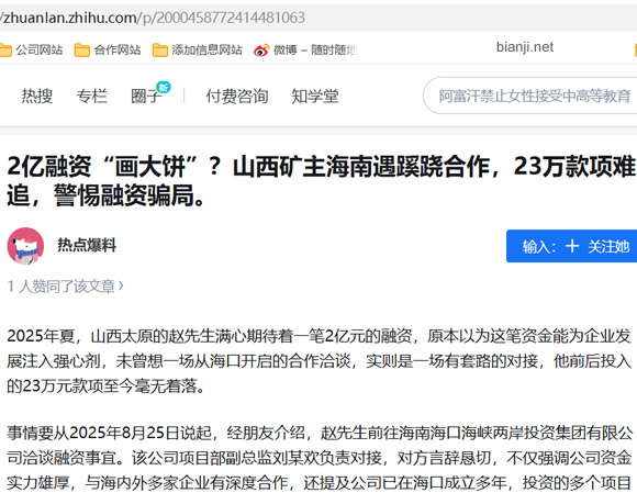 2025年夏,山西太原的赵先生满心期待着一笔2亿元的融资,原本以为这笔资金能为企业发展注入强心剂,未曾想一场从海口开启的合作洽谈,实则是一场有套路的对接,他前后投入的23万元款项至今毫无着落。