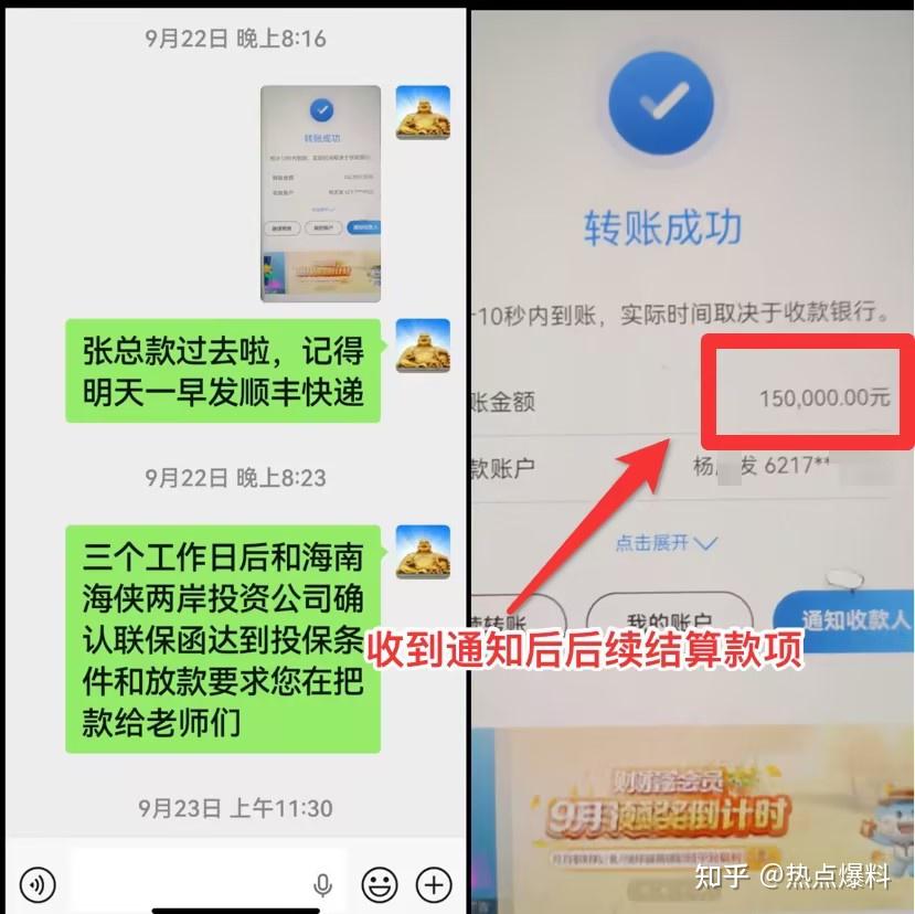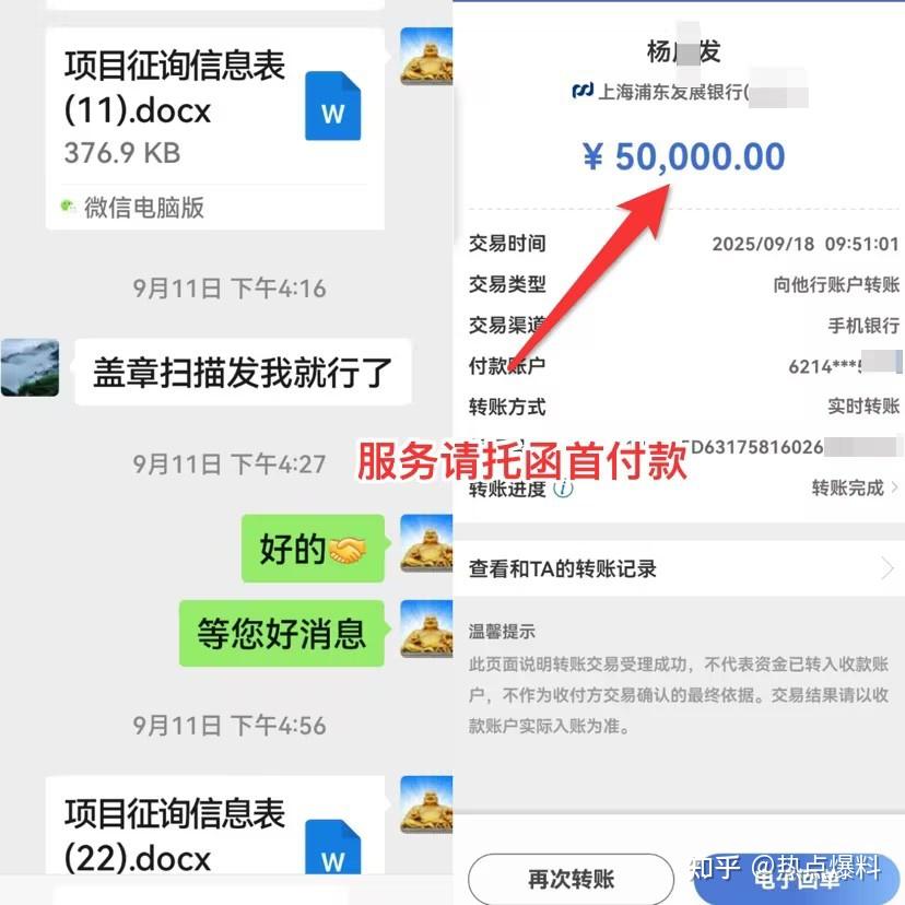 9月9日,高某垚进一步指引赵先生联系张总,签订服务请托函。9月18日,张总告知赵先生,需向杨某发转账5万元作为首付款,方可推进后续流程。转账前,赵先生特意多次致电刘某欢核实,询问"是不是拿到联保函就能放款",刘某欢给予肯定答复,称"对,我们要的就是联保函,有了之后三两天就能放2亿元"。