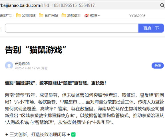 �� 生态更可持续:逐步推动补贴转化为“绿色模范市场”荣誉激励,探索“绿色信用积分”与商业优惠联动,构建社会化激励生态。让数据说话,让治理可见。海南华控环保,以数字技术助力禁塑长效机制建设,打通末端执行壁垒,推动环保意识深入人心,为海南国家生态文明试验区建设注入智慧动能。