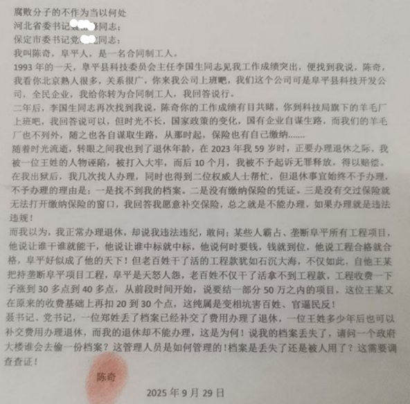 随着时光流逝,转眼之间我也到了退休年龄,在2023年我59岁时,正要办理退休之际,我被一位王姓的人物诬陷,被打入大牢,而后10个月,我被不予起诉无罪释放,得以赔偿。在我出狱后,我几次找人办理,同时也得到二位权威人士帮忙,但退休事宜始终不予办理,不予办理的理由是;一是找不到我的档案。二是没有缴纳保险的凭证。三是没有交过保险就无法打开缴纳保险的窗口,我回答我愿意补交保险,总之就是不能办理,如果办理就是违法违规!