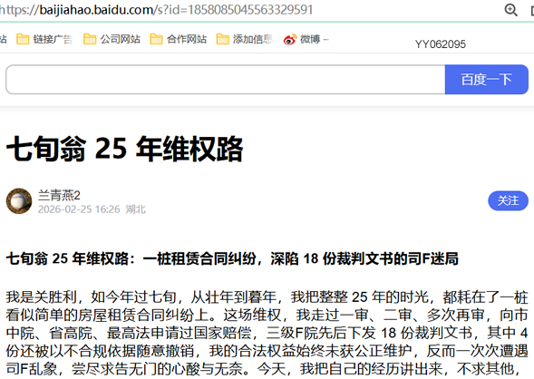 一桩简单的房屋租赁合同纠纷,为何会演变成跨越 25 年的维权持久战?为何三级F院会下发 18 份事实认定不清、法律适用混乱的裁判文书?为何合法的签约行为,让我蒙受巨额损失却求告无门?为何司F裁判中会出现非事实因素干预的情况?这些问题,不仅关乎我一个人的合法权益,更关乎司F的公正与权威,关乎每一个普通民众对法律的信任。
