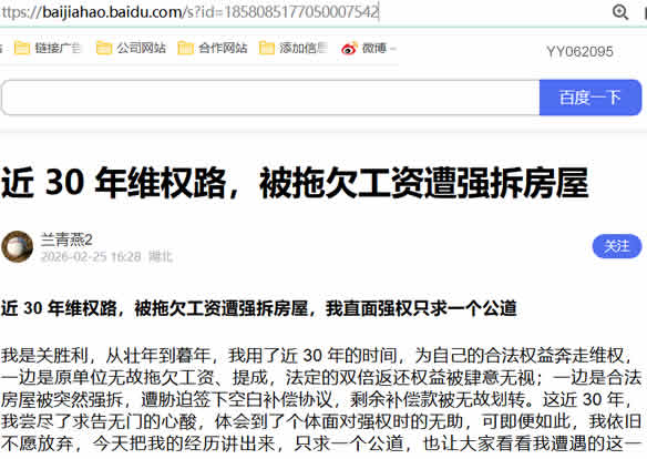 我是关胜利,从壮年到暮年,我用了近 30 年的时间,为自己的合法权益奔走维权,一边是原单位无故拖欠工资、提成,法定的双倍返还权益被肆意无视;一边是合法房屋被突然强拆,遭胁迫签下空白补偿协议,剩余补偿款被无故划转。这近 30 年,我尝尽了求告无门的心酸,体会到了个体面对强权时的无助,可即便如此,我依旧不愿放弃,今天把我的经历讲出来,只求一个公道,也让大家看看我遭遇的这一切。